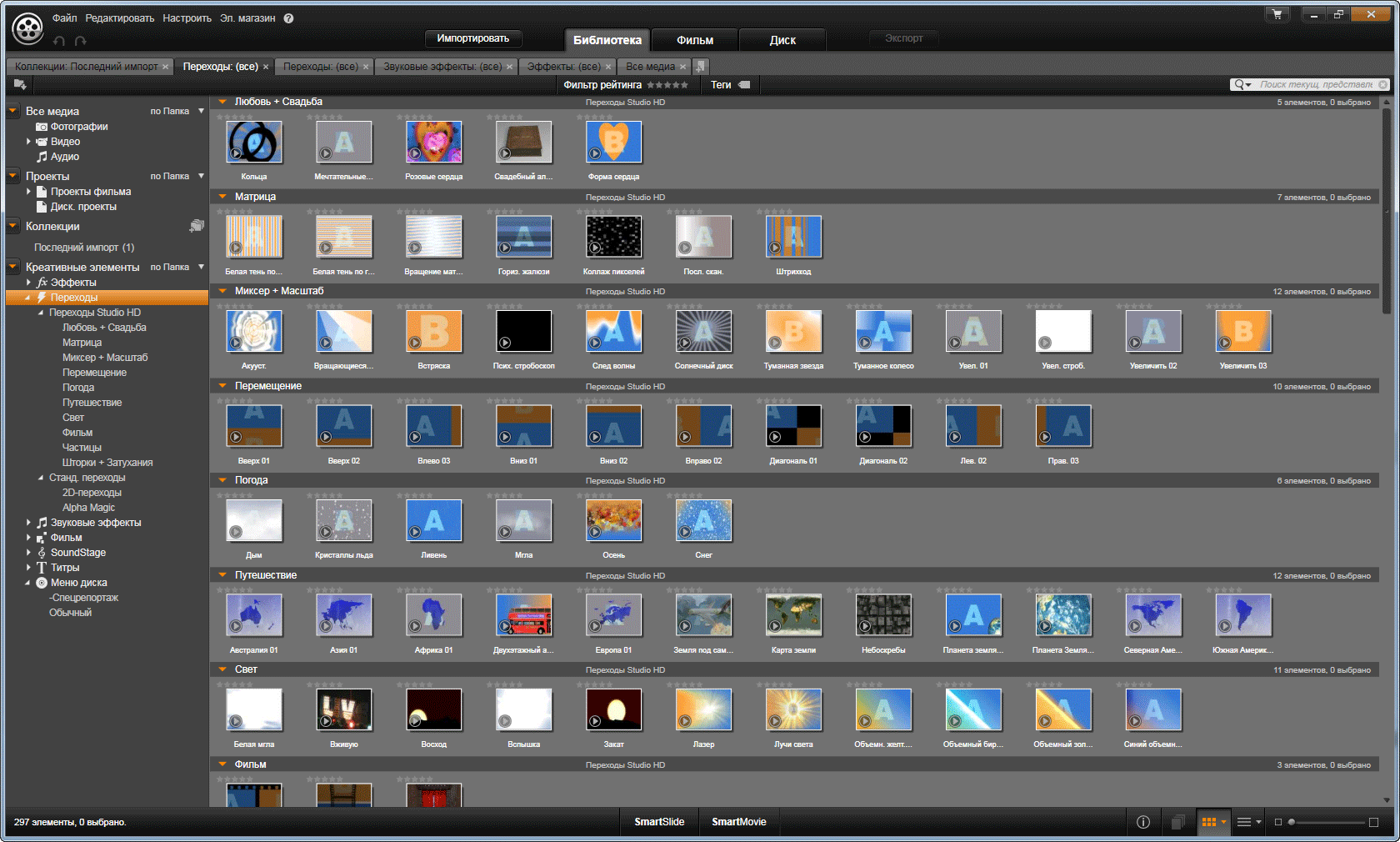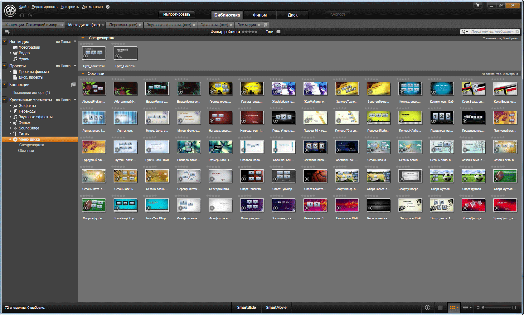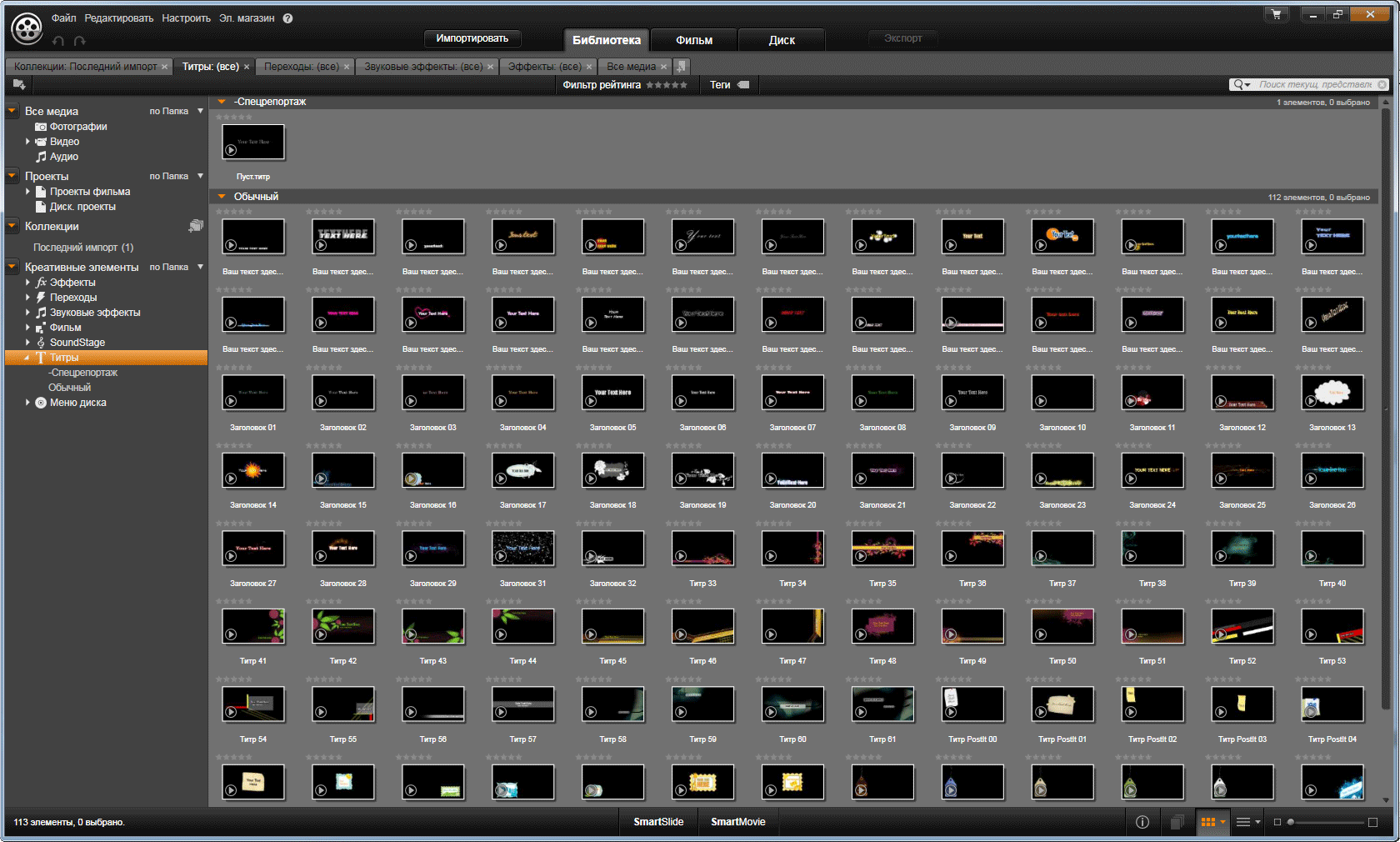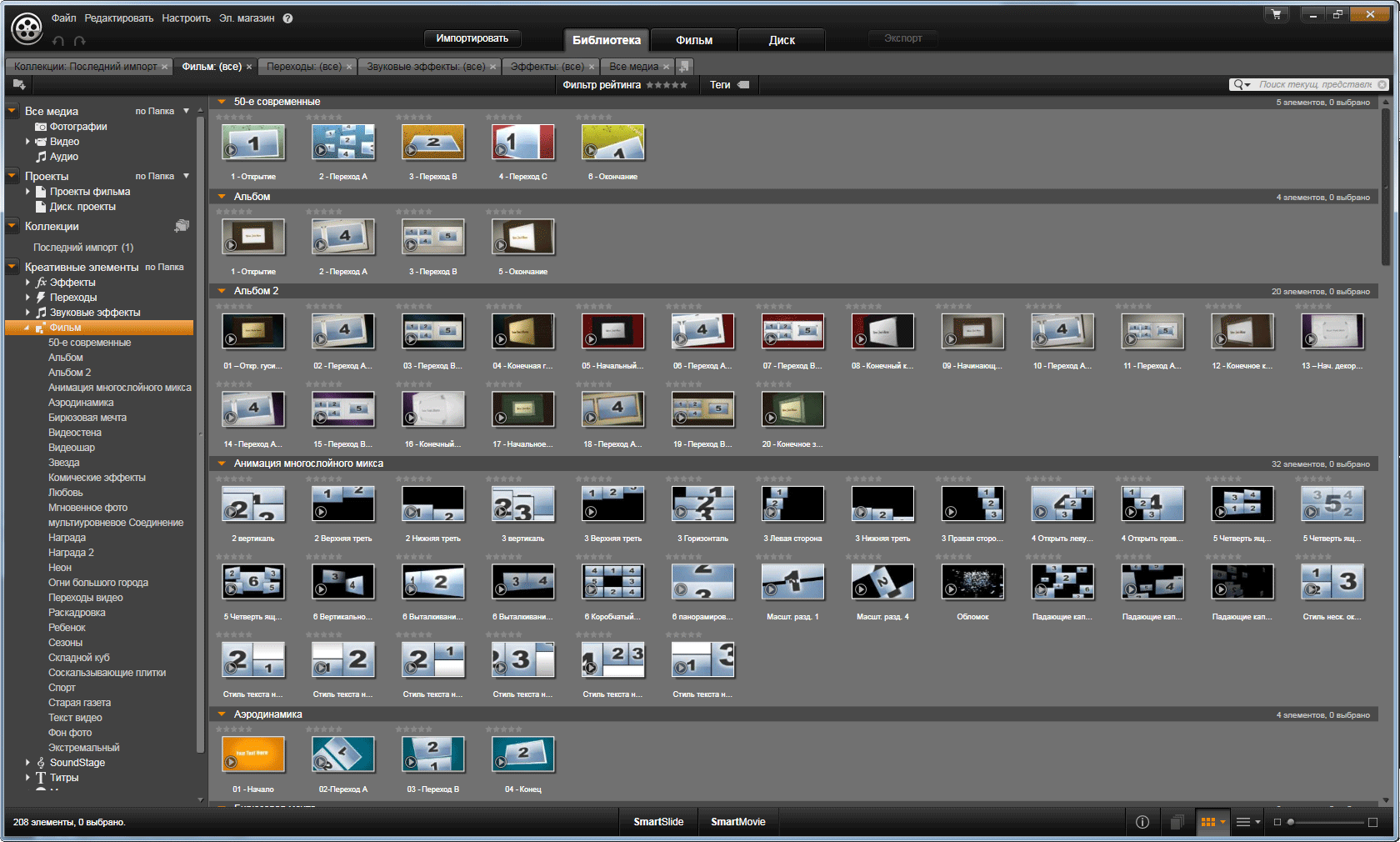 | Эффекты | Переходы | Шаблоны оформления | Шаблоны титров | Шаблоны меню дисков |