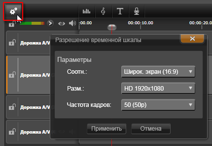 Но вернёмся к интерфейсу программы. Глядя на него, у многих пользователей могут возникнуть ненужные ассоциации с любительской программой. Поверьте, это не так. Инструменты, которым разработчик придал столь непритязательный вид, вполне соответствуют требованиям к инструментам продвинутого видеоредактора. Например, имеющаяся в левом верхнем углу таймлинии иконка с шестерёнками предназначена для быстрого изменения параметров проекта. Нажатие на эту кнопку вызывает диалоговое окно, где можно изменить соотношение сторон кадра, размер и частоту.