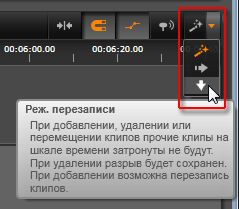 Также, в отличие от любительских видеоредакторов, Avid Studio позволяет расположить материал на любой дорожке и в любом её месте, при этом автоматического сдвига ролика к началу дорожки или к границе соседнего клипа не происходит. Впрочем, поведение клипов на таймлинии можно изменить на лету посредством выбора соответствующей опции в выпадающем списке, который расположен в правом верхнем углу таймлинии.