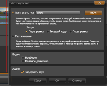 Так, скорость проигрывания клипа изменяется в модуле, вызываемом командой Скорость. К сожалению, присутствующее здесь ограничение в 500% не даёт возможности увеличить скорость ещё выше.