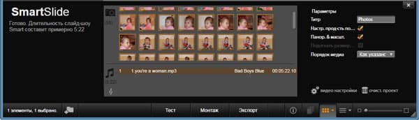 Создание фото-слайд-шоу производится предельно просто: достаточно лишь перетащить нужные фотографии в предназначенное для них поле, добавить музыку и определиться с довольно скудными настройками.