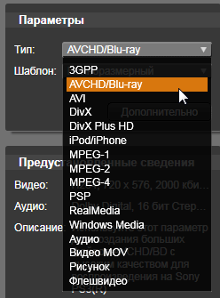 Программа позволяет создать три типа дисков: Blu-ray, AVCHD и DVD.