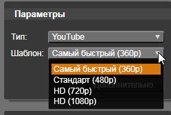 Пункт «Сеть» вполне можно было назвать просто «YouTube». Потому, что в списке «Тип» присутствует лишь один YouTube. Правда, четыре имеющихся здесь шаблона, от 360p до 1080p, неплохо сглаживают картину. Но всё же, думается, какой-никакой Vimeo добавить-таки нужно.