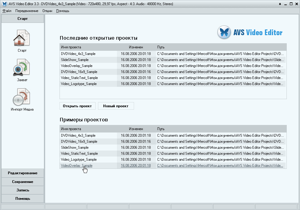 Сразу после запуска программы вы увидите список последних открытых проектов, а также ссылки на примеры. Странно, ведь мы впервые запустили программу, откуда же у нас взялись готовые проекты в папке с документами пользователя?