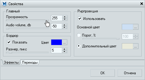 Помимо таких эффектов, как прозрачность видео и бордюр вокруг кадра, здесь присутствует непонятная непосвященному функция с названием Рирпроекция. На поверку оказалось, что под этим названием скрывается довольно популярная функция, называемая кеинг, то есть, исключение из видеокадра ненужного цвета (данный эффект используется сплошь и рядом на телевидении в виртуальных студиях). В данном случае имеется возможность исключения двух цветов, которые выбираются инструментом "Пипетка" нужно нажать на пиктограмму с этим инструментом и, не отпуская кнопки мыши, перетащить курсор в то место кадра, где находится нужный (а точнее, ненужный) цвет.