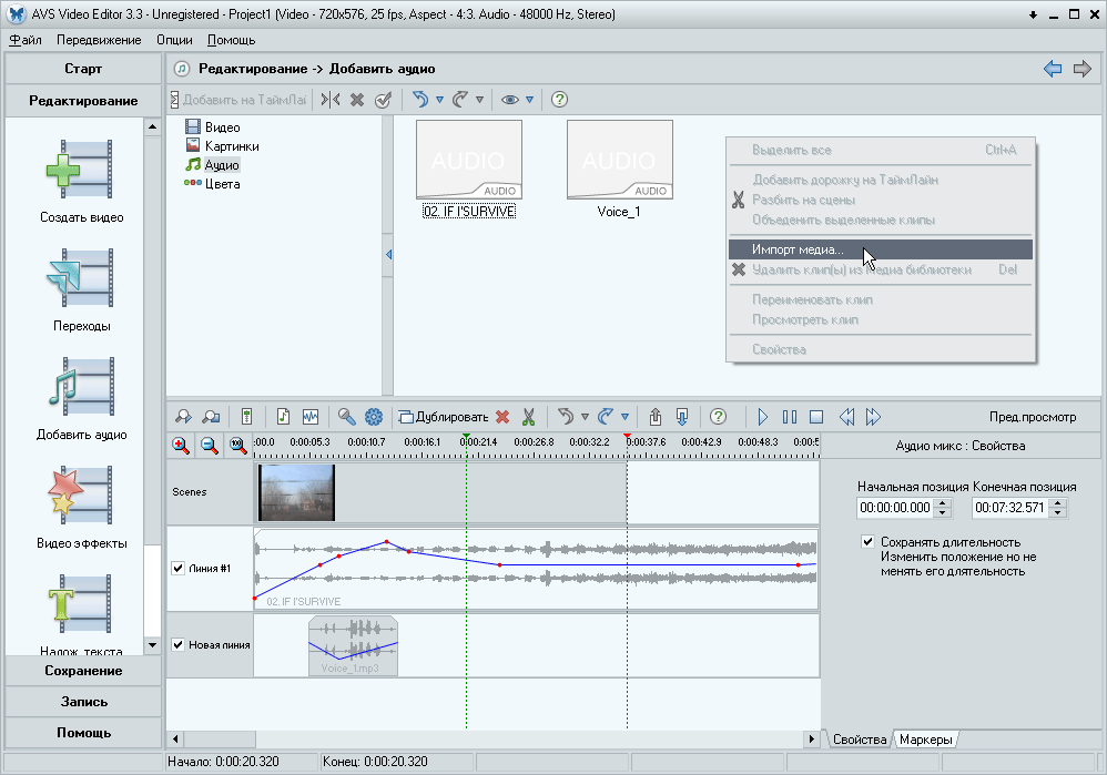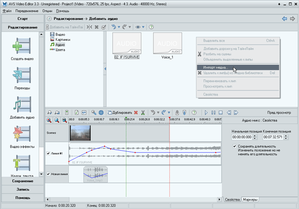 Случается так, что звук, добавленный к фильму, нуждается в более глубоком редактировании, нежели простое изменение его уровня. Здесь и пригодится одна из программ-сателлитов, установившихся вместе с AVS Video Editor. Выделите, например, дорожку звука, записанного с микрофона, и нажмите клавишу F4 либо кнопку