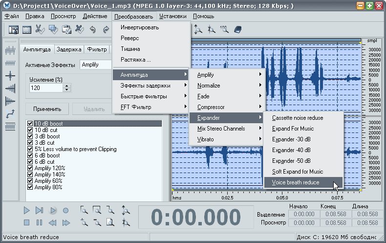 Потенциал данной программы, на первый взгляд, скромен, однако с ролью быстрого редактора она справляется на ура, к тому же ничто не мешает расширить функциональность, подключив DirectX-фильтры сторонних разработчиков. Здесь имеются такие часто требуемые функции, как удаление шипения (при записи с аудиокассет, например), добавление эха, изменение тембра голоса и многие другие интересные возможности.