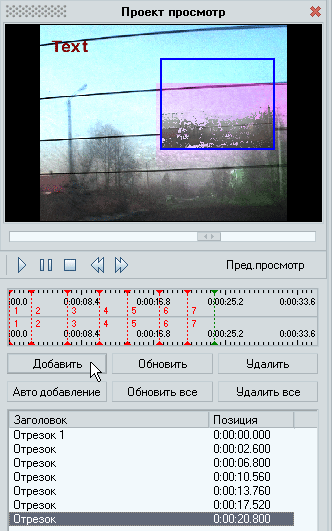 Теперь самое время посмотреть, что у нас получилось после проделанного. Нажмите кнопку Пред. просмотр, находящуюся в правой части программного окна сразу над таймлинией. Появившееся окно просмотра позволяет, кроме собственно просмотра, еще и отредактировать некоторые эффекты, а именно изменить размеры области их действия.
