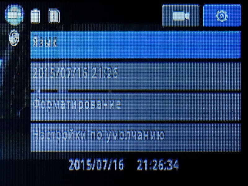 Лаконичное служебное меню, отображаемое на дисплее камеры, разбито на две категории: настройка параметров текущего режима (видеокамера/фотоаппарат), и системные настройки. Как уже говорилось, список опций неполон — в мобильном приложении можно отыскать пункты, которые здесь отсутствуют.