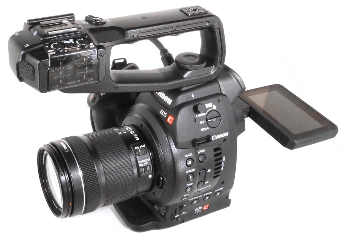 Комплектность, которая представлена на фото ниже, может отличаться от «магазинной». Тем более, если иметь в виду объектив. Ведь данная камера, в отличие от любительских видеокамер и аппарата полупрофессионального уровня, не имеет собственного встроенного объектива, а может работать с любым подходящим по типу крепления: EF или EF-S. Впрочем, неотъемлемые от камеры предметы назвать несложно. Это верхний управляющий блок-рукоятка для переноски и удерживания и боковой блок, также оснащенный рукоятью, только мягкой.