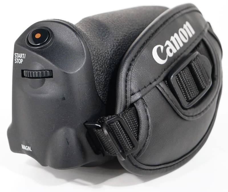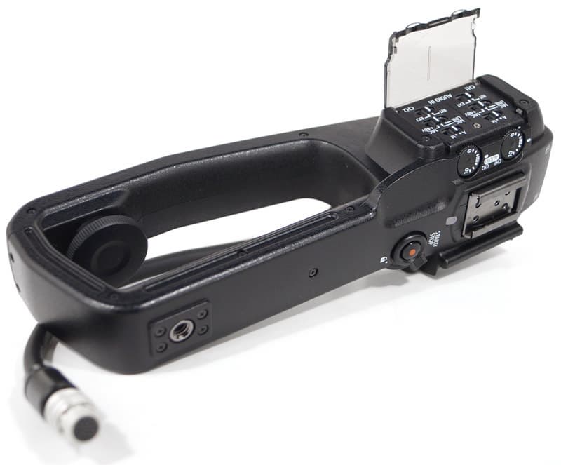 Боковая рукоятка по форме напоминает пистолетную, и имеет управляющие элементы: кнопку-джойстик для навигации по меню и изменения некоторых параметров, программируемую кнопку, колесо подстройки и еще одну кнопку записи, которая находится под указательным пальцем руки, просунутой в удерживающий ремень. Примечательно, что данная рукоятка может быть прикреплена к корпусу под любым углом по вертикали.