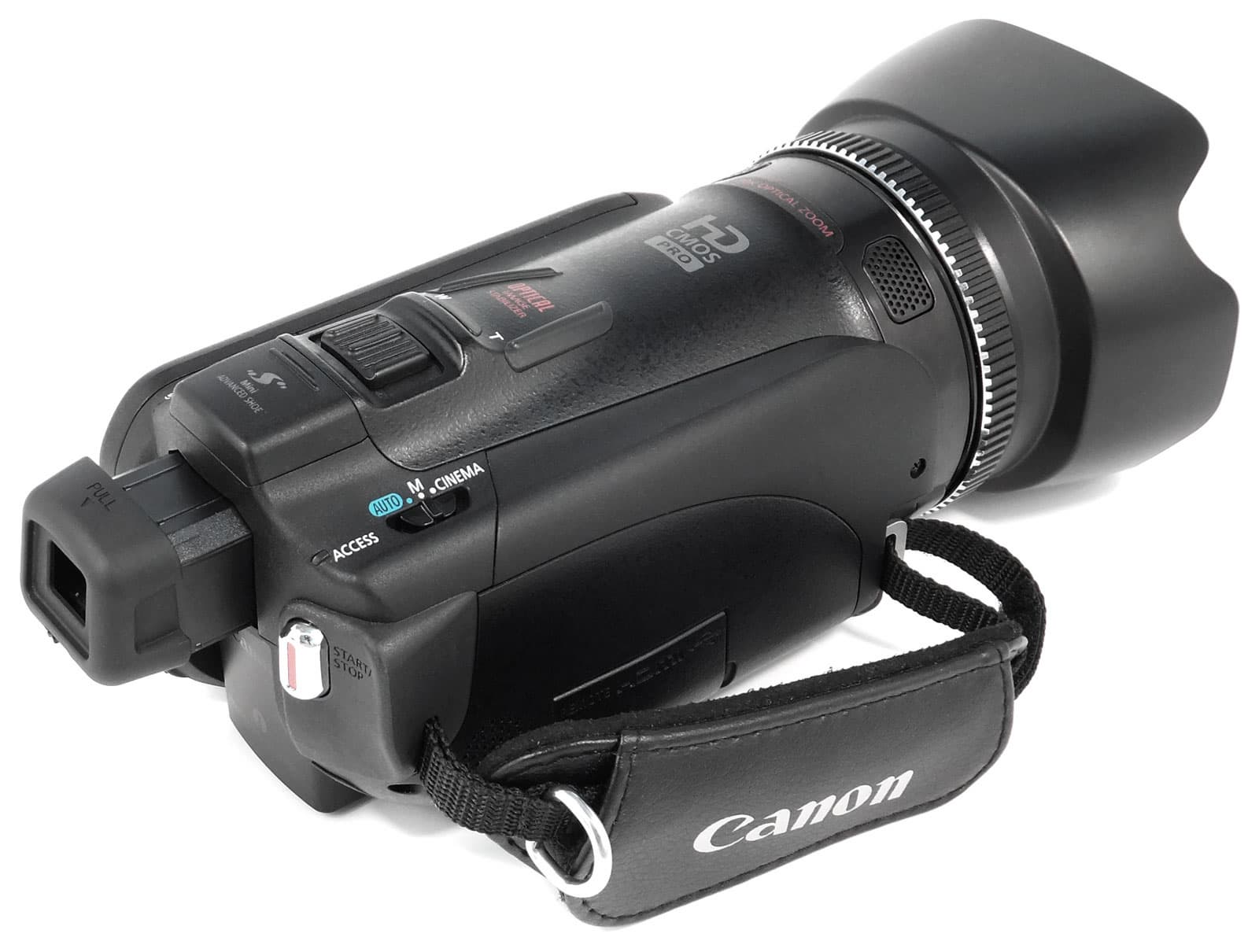 Верхняя часть корпуса оснащена рычажком-качалкой зума. Скорость (чувствительность) этого рычажка можно изменить в настройках. Ближе к рукоятке расположен переключатель режимов работы камеры: автоматический режим, режим ручных настроек и режим Cinema. На торце находится традиционная кнопка старта записи, видоискатель выдвигается из корпуса на 15 мм, угол наклона видоискателя не изменяется.