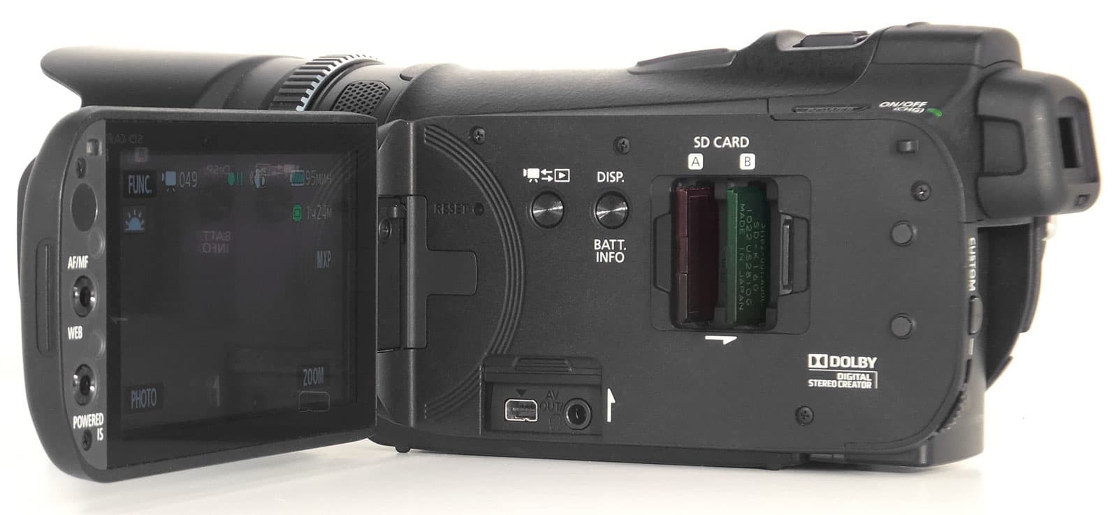 Под ремнем располагаются разъем для подключения приобретаемого отдельно пульта дистанционного управления ZR-2000 или ZR-1000, выход Mini-HDMI и порт Mini-USB 2.0. Эти разъемы прикрыты откидывающейся пластмассовой дверцей на петлях. Здесь же, под ремнем, находится встроенный динамик. Рядом с аккумулятором находится прикрытый резиновой заглушкой вход для подключения адаптера питания/зарядки батареи (аккумулятор заряжается, будучи подсоединен к камере). Ближе к объективу имеется ничем не прикрытый разъем 3,5 мм для подключения внешнего микрофона.