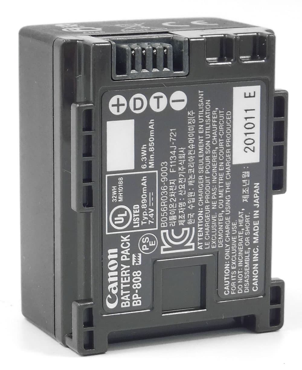Камера комплектуется литий-ионным аккумулятором BP-808 емкостью 890 мА·ч. Эта не очень-то емкая батарея позволяет вести беспрерывную запись в режиме SP с работающим ЖК-экраном в течение 104 минут. Это время продлевается до 130 минут, если ЖК-экран и видоискатель выключены и не работают (камера умеет вести запись с закрытым экраном и видоискателем).