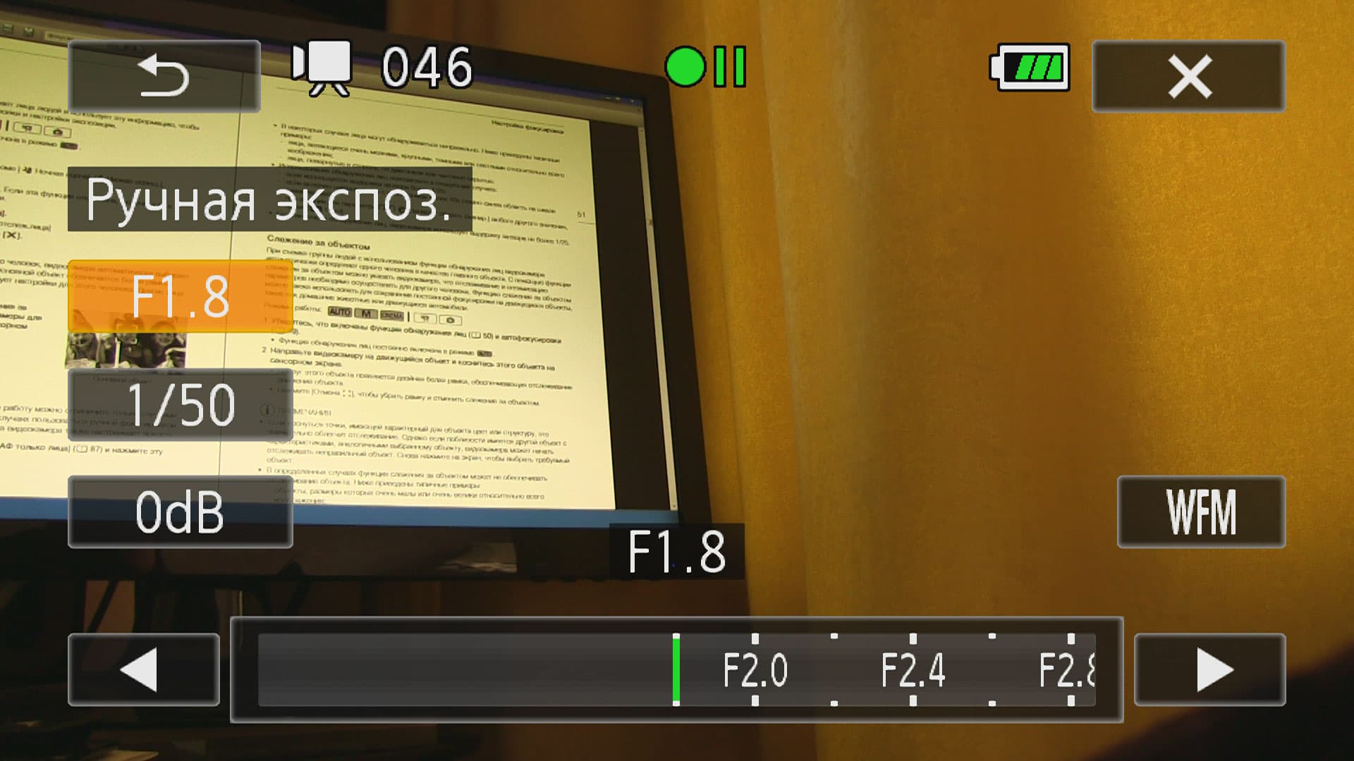 Автоматические настройки экспозиции отличаются тем, что здесь пользователь полностью контролирует все параметры, влияющие на количество света в кадре. Щелкнув пальцем по настройке диафрагмы, приоткроет ее. Щелчок по настройке выдержки — так же быстро и легко изменит время экспозиции. Если потребуется включить или убрать усиление, к его услугам соответствующая иконка. В этом меню настроек пользователь может также видеть осциллограф (как уже говорилось, он не выводится на внешний монитор, вместо осциллографа мы видим на следующем фото иконку с буквами WFM).