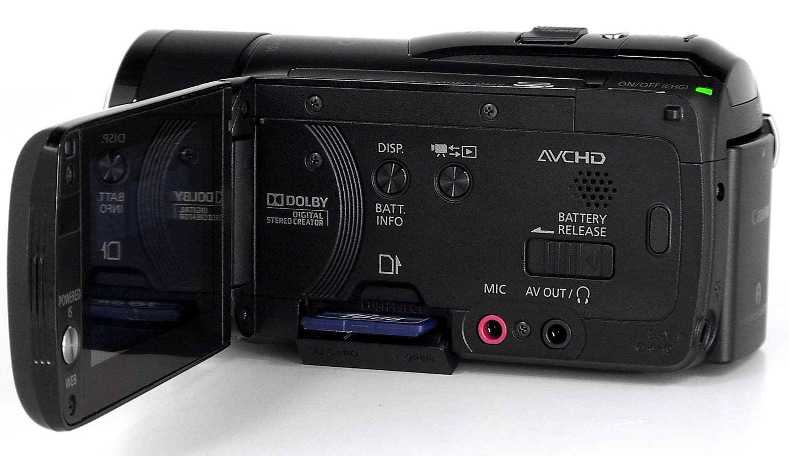 Корпус видеокамеры выполнен из качественной пластмассы с глянцевым покрытием. Объектив апарата защищён автоматически раскрывающимися и закрывающимися шторками, резьба на объективе имеет диаметр 37 мм. Под объективом слева расположен датчик мгновенной автофокусировки, являющийся частью системы с фирменным наименованием Instant AF. Под объективом имеются направленные вперёд стереомикрофоны, правее от них — миниатюрная лампочка для подсветки близкорасположенных объектов при съёмке в условиях недостаточной освещённости (для того, чтобы её включить, пользователю придётся найти нужный пункт в программном меню). На выступе справа от объектива находится встроенная фотовспышка.