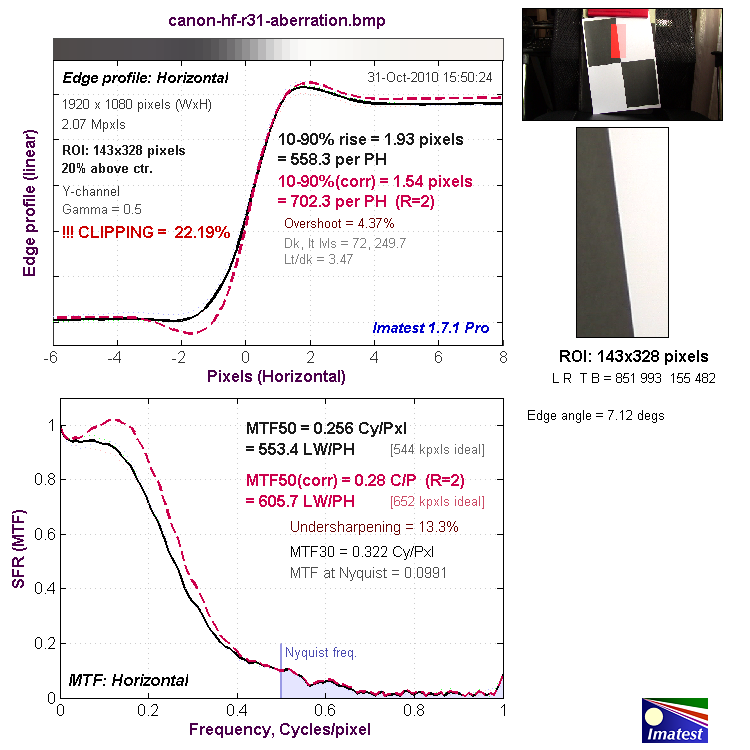 Верхний график представляет собой краевой профиль, для которого приведено значение 10—90% rise distance в пикселях, а нижний график представляет собой MTF (Modular Transfer Function — функция передачи модуляции), для которой приведен параметр MTF50 в циклах на пиксель. Краевой профиль и MTF камеры показаны черной линией. Красной пунктирной линией обозначен краевой профиль и MTF, которые программа Imatest считает близкими к оптимальным. 10—90% rise distance и MTF50 также являются расчетными величинами Imatest.