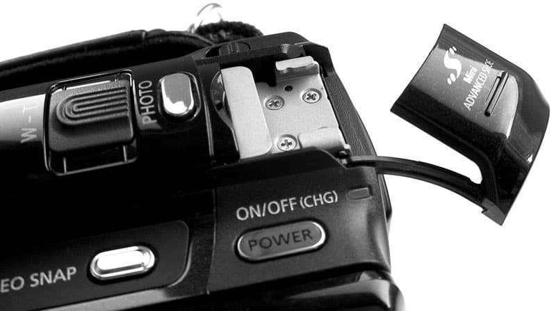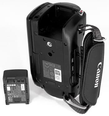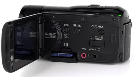 Прилагаемый аккумулятор позволяет вести съёмку в течение 117 минут с закрытым ЖК-экраном и 103 минут — с открытым. Что касается интерфейсов, то сходу найти их не так-то просто. Все выходы спрятаны под откидывающейся заглушкой, которая, в свою очередь, находится в нижней части корпуса со стороны рукоятки. Здесь расположены компонентный видеовыход, порт USB и выход HDMI.