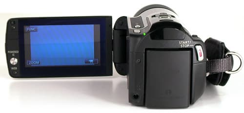 Видеокамера включается кнопкой, расположенной в верхней части корпуса над ЖК-экраном. Только кнопкой, и никак иначе. Время от момента включения до полной готовности к записи — 3 секунды, что очень неплохо.