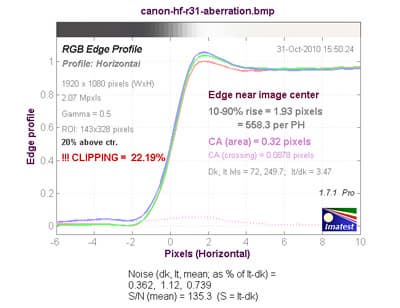 График хроматической аберрации (на самом деле это тот же краевой профиль, только построенный по каждому цвету в отдельности). При значении параметра CA (area) равного 0-0,5 хроматическая аберрация незаметна.