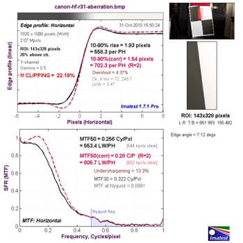 При съёмке тестовой таблицы пришлось подключать камеру к внешнему монитору, с тем чтобы границы кадра точно подогнать под требуемый размер. Дело в том, что ЖК-экран видеокамеры «обрезает» края кадра, отображая на 10% меньше, чем на самом деле записывается (точно такое же поведение экрана было отмечено в видеокамере Canon Legria HF R16).