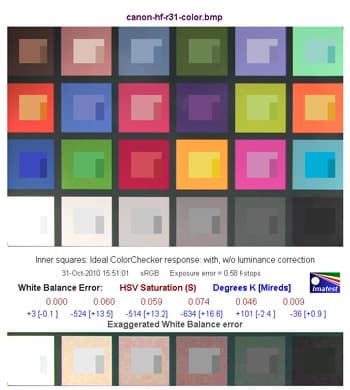 Средняя строчка цифр показывает нам численную оценку ошибки баланса белого в единицах цветового пространства HSV. Так, цифры красного цвета обозначают ошибку по координате S — saturation (насыщенность), цифры синего цвета — в градусах Кельвина [Миредах (Mireds)]. При значении S<0,02 (речь идет об ошибке по координате S в HSV), ошибка практически незаметна, а при ошибке S>0,10 она видна, особенно на нейтральных полях большой яркости.