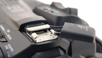 Рядом с видоискателем имеется сдвигаемая заглушка на длинной ножке, под которой находится миниатюрная колодка для крепления дополнительных совместимых принадлежностей (например, направленный стереомикрофон DM-100 и прочие аксессуары, имеющие логотип совместимости Mini Advanced Shoe).