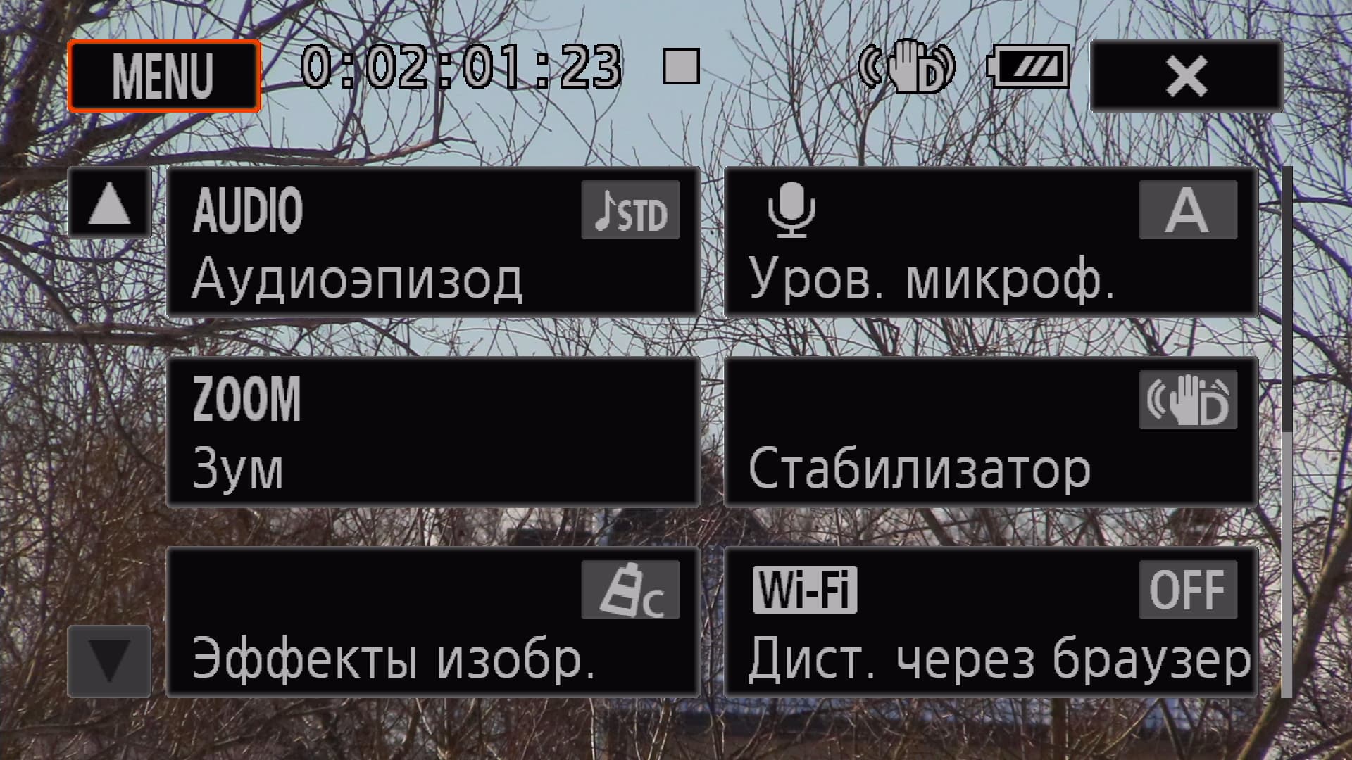 Ввиду того, что камера оснащена все той же матрицей с количеством пикселей, которого впритык хватает для формирования Full HD кадра, при включении электронной стабилизации угол обзора несколько уменьшается.