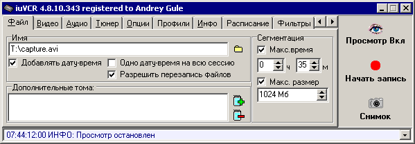 Группа Разное. Просмотр со Smart Tee — включает специальный режим, который обеспечивает возможность просмотра видео во время записи с карт захвата на базе чипа Conexant bt848/878. Выключить скринсейвер — на время работы iuVCR выключает экранную заставку системы Windows: это, во–первых, упростит просмотр видео во время захвата, во–вторых, позволит не выделять вычислительных мощностей компьютера экранной заставке. Старт с просмотром — окно просмотра видео будет открываться автоматически при запуске программы. Внутренний детектор FPS — включает альтернативный механизм сбора статистики о захваченных кадрах. Остановка без сигнала позволяет останавливать захват видео по окончании видеосигнала (конец видеокассеты, ТВ передачи и т.п.). Учтите, что короткие паузы между записями на плёнке, как и существенные повреждения записи, будут расцениваться как отсутствие видеосигнала: захват видео будет останавливаться.