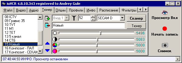 Эта закладка служит для управления ТВ приёмником и для переключения видео входов. При помощи кнопки Сканер активируется функция поиска ТВ каналов, по кнопке Тюнер вызывается окно настройки драйвера ТВ приёмника. В списке слева находится список настроек для различных источников видеосигнала: разные ТВ каналы или разные входы карты захвата. Варианты настроек можно добавлять или убирать, перемещать вверх и вниз по списку. Для каждого варианта настройки можно выбрать: видеовход (кнопка в виде значка — слева от номера канала), номер канала (для ТВ), название варианта настройки, формат видеосигнала; можно подстроить яркость, контрастность, цветность и насыщенность. В качестве видеовхода могут использоваться ТВ приёмник (антенный и кабельный диапазоны) или различные входы карты захвата: композитный, S–video. Удобно создать несколько вариантов настройки для одного и того же видеовхода, например «Композит – PAL» и «Композит – SECAM».