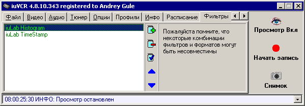 iuVCR позволяет при захвате обрабатывать изображение «на лету» фильтрами DirectShow, и лишь потом записывать. Конечно, применение фильтров «на лету» повышает ресурсоёмкость процесса захвата. iuVCR комплектуется набором высокоскоростных фильтров, которые специально оптимизированы для использования во время захвата. Это Inverse — для инвертирования цветов видео, Crop video — для обрезания краёв, Histogram — для удобной настройки яркости и контрастности (баланса белого) и TimeStamp — для накладывания на запись текущего времени и даты.