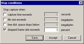 В окне Stop conditions вы можете задать условия остановки захвата: по прошедшему времени захвата (Capture time exceeds … seconds), по достижению файла определённого размера (File size exceeds … megabytes), по уменьшению свободного места на диске до заданного уровня (Free disk space drops below … megabytes) и по превышению количества пропущенных кадров определённого процента (Dropped frame ratio exceeds … percent). Кнопка Save позволяет сохранить настройки на будущее, кнопка Accept — только на текущий сеанс работы с программой.