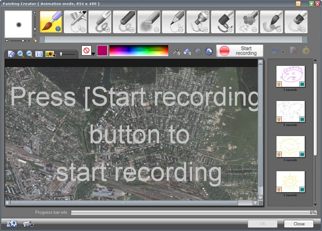 Окно данного инструмента представляет собой несложный с виду графический редактор с наглядными иконками. При запуске пользователь увидит надпись Press [Start recording] button to start recording, расположенную поверх обрабатываемого кадра, — что означает это предложение? Попробуем узнать, нажав одноименную кнопку.