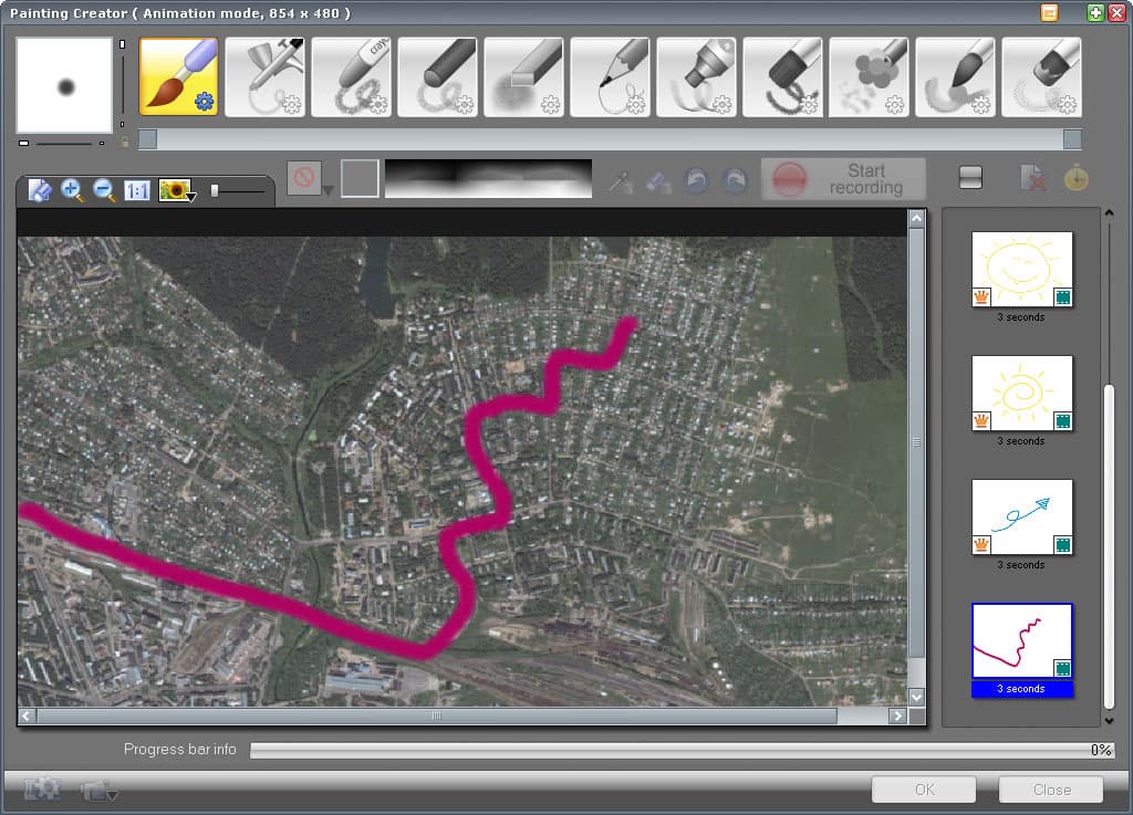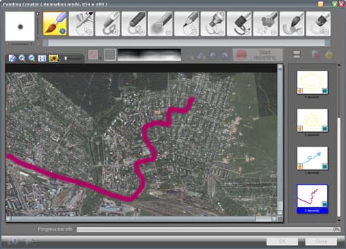 Теперь понятно! Как только мы нажали кнопку Start recording, так курсор мыши приобрел форму окружности — неужели это кисть? Так и есть! После нажатия кнопки Start recording пользователю предлагается рисовать этой кистью непосредственно на экране, в это время программа записывает траекторию движения курсора. Что получается в итоге?