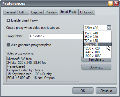 Настройки программы вызываются клавишей F6. Здесь, во вкладке Smart Proxy, пользователь может выбрать место хранения прокси-файлов (желательно использовать папку, расположенную на скоростном диске), размер кадра создаваемых временных файлов (чем больше разрешение, тем выше качество видео, отображаемого в окне редактирования), и даже кодек, которым следует кодировать данные файлы (чем он меньше требует ресурсов, тем быстрее пойдет работа).