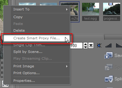 Прокси-файлы создаются лишь тогда, когда конкретный видеофайл помещается на таймлинию и с ним начинается какая-либо работа. Но ведь, как ни крути, фоновый процесс кодирования в иной формат (пусть и с минимальной степенью сжатия) всё равно требует машинных ресурсов, а, следовательно, должен отразиться на скорости работы и реакции программы на те или иные действия пользователя. Что, собственно, и происходит: во время создания прокси-файлов программа ощутимо "подтормаживает". Да, чудес не бывает, однако разработчик дальновидно предусмотрел возможность создания прокси-файлов вручную: достаточно выбрать в медиабиблиотеке нужные клипы, заранее импортированные в неё, и, щелкнув правой клавишей мыши, выбрать пункт Create Smart Proxy File...