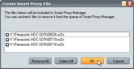 Тут же появится диалоговое окно, где вы сможете отметить флажками те клипы, для которых необходимо создать прокси-файлы.