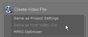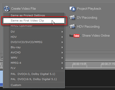 Последнее, что мы произведем — это проверку на способность программы работать с видеофайлами без перекодирования. В качестве подопытного видео используем, конечно, злободневный AVCHD. Видео с камер JVC GZ-HD7ER, SONY HDR-SR7, Panasonic HDC-SD1, и Sanyo Xacti VPC-HD700. Выяснить, способна ли программа вывести какой-либо файл без перекодирования, очень просто. Достаточно разместить на таймлинии нужный клип, перейти на вкладку Share, и щелкнуть по иконке с надписью Create Video File. Выпадающее меню содержит несколько различных пунктов, но нам интересен лишь один: Same as First Video Clip.