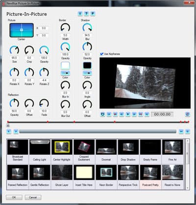 Вторая категория, NewBllue Video Essentials II, представляет собой копилку множества фильтров. Общее назначение каждой из заготовок — эффектный PiP, с отражением и без такового, со светящейся каёмкой и без неё, и т.д. и т.п. Уйма настроек позволят до неузнаваемости изменить заготовку, вот только сохранить её на будущее не представляется возможным — а жаль.