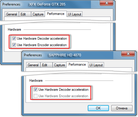 Не секрет, что параметры кодирования при помощи графического процессора видеокарты могут значительно отличаться от параметров кодирования силами центрального процессора (это мы знаем из предыдущих опытов с NVIDIA CUDA). Чтобы ещё раз (в который уж!) подтвердить этот постулат, был проведён тестовый просчёт 10-секундного ролика со сложным для кодирования содержимым: «живая» водная гладь. К сожалению, в тесте не участвовала видеокарта SAPPHIRE HD 4870 — её графический процессор может только декодировать, но не кодировать видео (флажок, отвечающий за активацию GPU-кодирования, оказался неактивным).