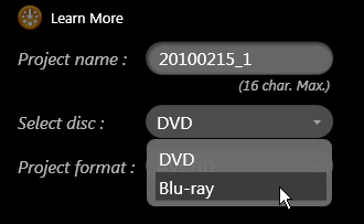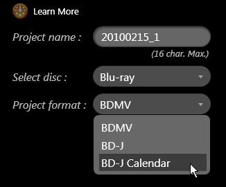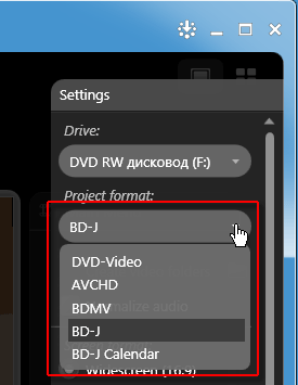 Если пользователь выбрал создание Blu-ray диска, то в строке Project format (формат проекта) появятся дополнительные пункты: BDMV (стандартный Blu-ray диск), BD-J (Blu-ray Java, диск с меню, реализованном на языке Java), и BD-J Calendar (также с Java-меню, но имеющем вид календаря).
