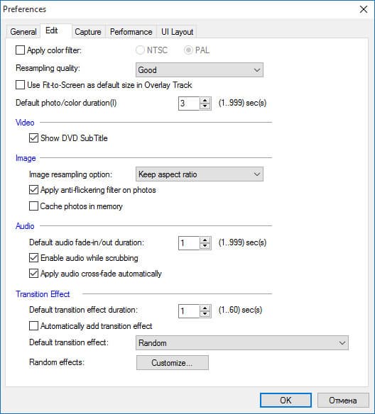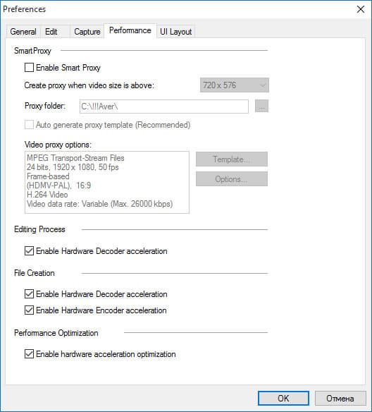 | Общий настройки: количество шагов отката действий, расположение временных папок (желательно размещать их на быстрых дисках), выбор ТВ-системы | Параметры обработки видео- аудиоматериала, длительность переходов по умолчанию | Параметры захвата и представления захваченного материала | Включение/отключение технологии прокси (создание временных файлов), облегчающей работу на слабых компьютерах; задействование аппаратной поддержки |