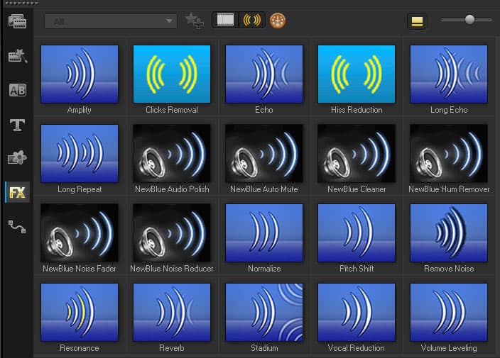 Обработке звука в видеоредакторе Corel традиционно уделяется немало внимания. Рассматриваемая 9-я версия программы содержит фильтры, позволяющие провести глубокую работу по очистке и другому изменению аудио. Эти фильтры находятся в копилке эффектов, в разделе FX — чтобы их увидеть, нужно активировать кнопку Show Audio Filters. Отметим, что здесь, помимо «родных» аудиофильтров Corel, имеются инструменты от компании NewBlue, известного разработчика фильтров и эффектов для обработки медиаконтента.