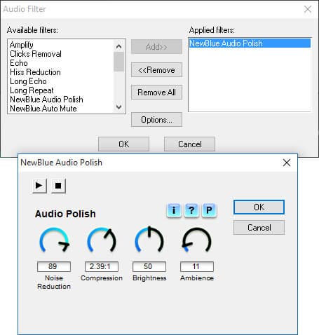 Большинство аудиофильтров имеет настройки, которые открываются в отдельном мини-окошке. Результат изменения параметров можно оценить по ходу работы не закрывая окно, включив воспроизведение звука.