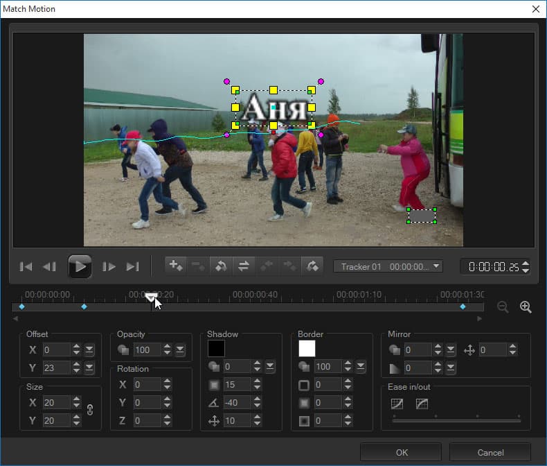 Надеемся, что обычный любитель, снимающий и монтирующий видео для себя и своих близких, не страдает этими юридическими предрассудками. Поэтому функцию трекинга он будет использовать с гораздо большей фантазией. Например, «прицепить» к бегущим фигуркам их имена. Это нетрудно сделать в рассматриваемом Corel VideoStudio, несмотря на то, что трекинг всегда считался функцией, имеющейся только в программах композитинга, а это гораздо более сложный и узкоспециализированный класс программ.