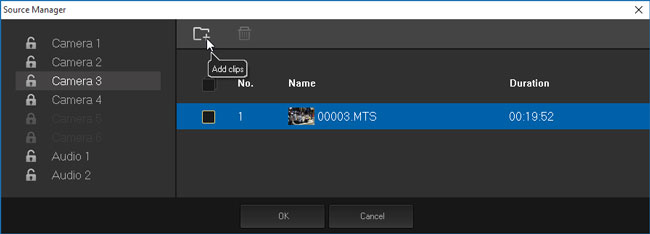 Наполнение проекта видеоматериалом производится в окне Source Manager (можно перевести как менеджер источников). Здесь можно импортировать видео с разных камер, разложив его соответственно нумерации по разным слотам, которые имеют названия Camera 1, Camera 2 и т. д.