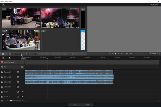 Многие видеоредакторы, имеющие функции мультикамерного монтажа, оснащены механизмами автоматической синхронизации материала с разных камер. Единственным разумным и эффективным способом является синхронизация по звуковой дорожке, когда программа анализирует аудио со всех видеороликов, впоследствии сопоставляя полученную звуковую картинку. К сожалению, этот способ — слишком требовательный к качеству и параметрам звука. Для гарантированной работы такого механизма требуется, чтобы звук в синхронизируемых видеороликах имел примерно одинаковый уровень и — главное — одинаковое содержание. то есть, предполагается, что все синхронизируемые камеры вели запись примерно с одной точки. Но ведь в жизни такого не бывает! Камеры, если уж они использовались для многокамерной съемки какого-то события, наверняка были расставлены в разных точках помещения, а не установлены впритык друг к другу. Соответственно звук, записанный каждой камерой, может сильно отличаться. Что, в общем-то, и произошло в нашем случае — программа после быстрого анализа аудиодорожек не сумела отыскать реперные точки и попытка автоматической синхронизации провалилась.