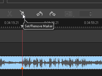 Включив воспроизведение одного из роликов — например, с камеры номер 1 — отыщем точку, на которую впоследствии будем опираться. Такой точкой может служить знаковый момент, отчетливо различимый на аудио диаграмме. Например, громкий звук после периода тишины, или запоминающаяся реплика ведущего (вообще, в самом начале многокамерной съемки, когда запись на всех камерах запущена, оператору будет полезно погреметь ключами или постучать вилкой по бокалу — потом, при монтаже, сам себе низкий поклон отвесишь за такую предусмотрительность). Отыскав нужный момент и остановив ползунок в этом месте, надо нажать кнопку с изображением маркера. Готово — теперь оранжевый маркер накрепко приклеился к конкретному месту где-то в серединке видеоролика, снятого камерой №1.