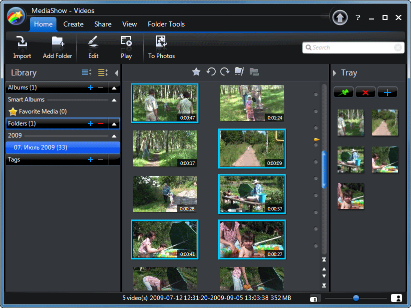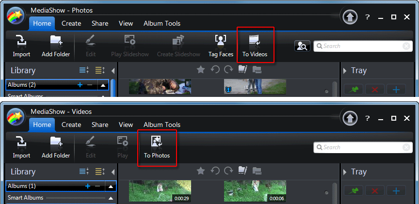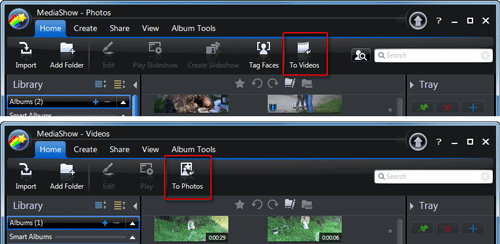 Импорт в программу фото- видеоматериала производится автоматически, как только вы укажете расположение нужных папок. После быстрого фонового индексирования файлов, импортированный материал будет разбит на две категории: фото и видео. Переход из одной в другую осуществляется кнопками "To Videos" и "To Photos", расположенными на главной панели инструментов.