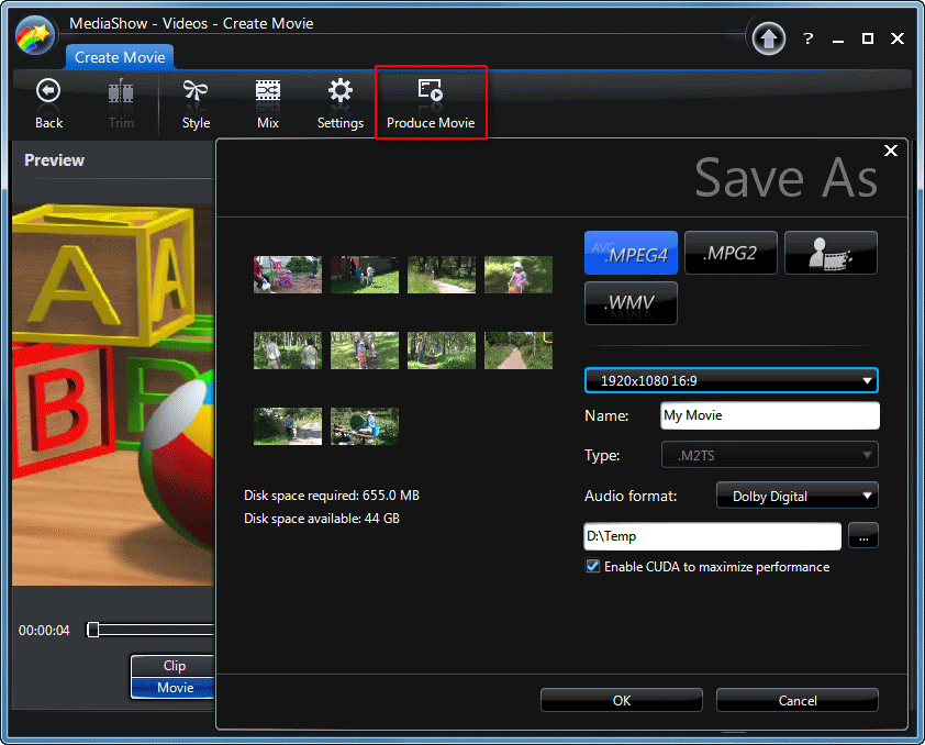 Что остаётся делать с практически готовым фильмом, как не вывести его в видеофайл нужного формата? В этом поможет уже не раз упоминавшийся модуль, вызываемый кнопкой Produce Movie (и здесь, как видим, имеется уже привычный пункт Enable CUDA to maximize perfomance).